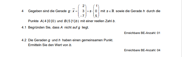 -Die Gerade h geht durch die Punkte A (4 | 0 | 0) und B (5 | 1 | b) und kann in Parameternform geschreiben werden als: